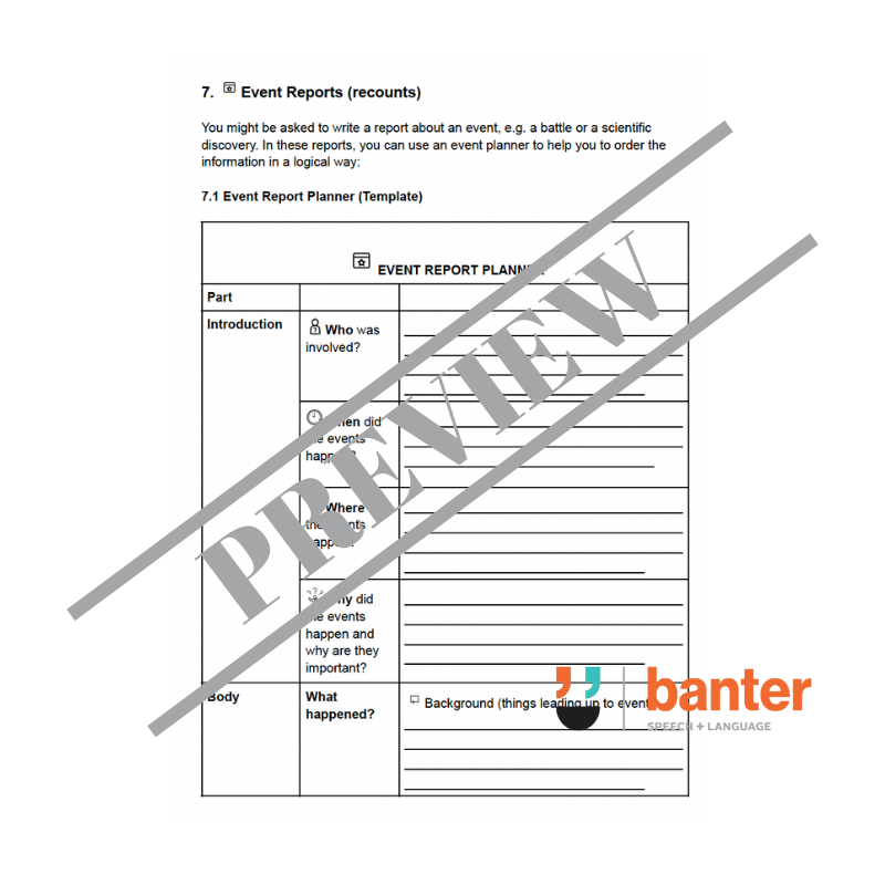 7. Seventh, we teach how to write Event Reports. We introduce an Event Report Planner, to be used with the First Draft and STOPS Editing Scaffolds, and the Transitions Helper, with an example report and practice exercises.
